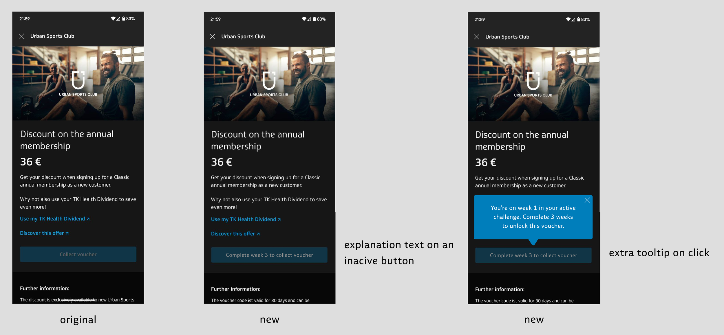 I explored the issue of an unclear rewards flow in the TK Fit app and how it could be redesigned to improve voucher engagement rates and overall feature awareness. By making it clearer when vouchers become available and by explaining how the feature works, the proposed solution can help to keep users engaged with the rewards section, give users extra motivation to complete challenges, and make TK’s digital health offering feel even more valuable.